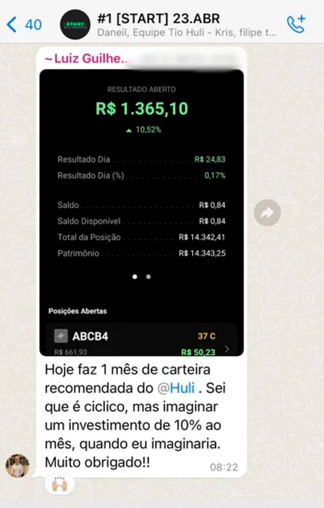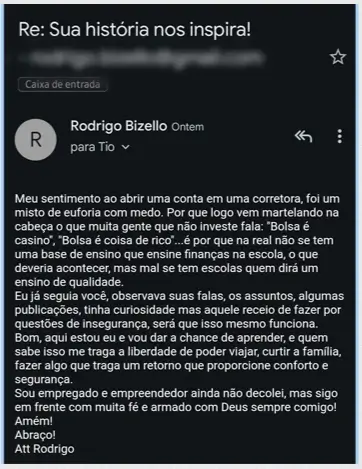 Assim você terá sempre orientação e nunca vai precisar se sentir sozinho ou perdido no mercado financeiro. Esse é o tipo de suporte que eu prezo, pegando na sua mão e te direcionando no caminho do dinheiro.